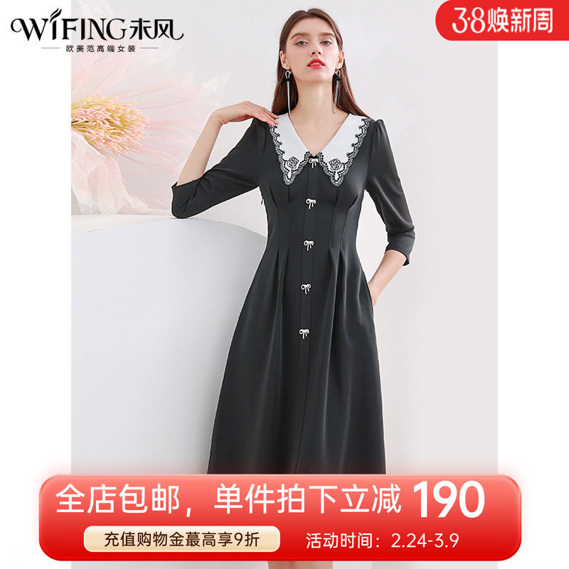 未风黑色娃娃领连衣裙女春2026年春装新款女装气质显瘦七分袖裙子
