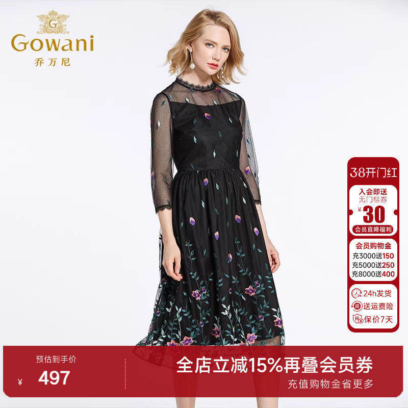 乔万尼春装女商场新款修身高腰气质绣花网纱七分袖连衣裙中长韩版
