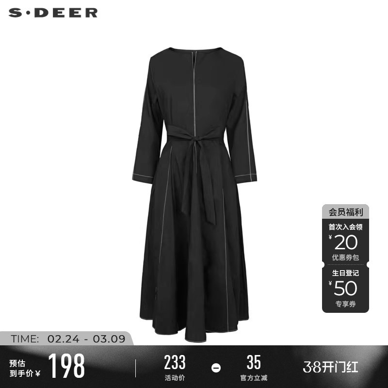 sdeer圣迪奥春装女装复古V领撞色收腰七分袖连衣裙S241Z1297