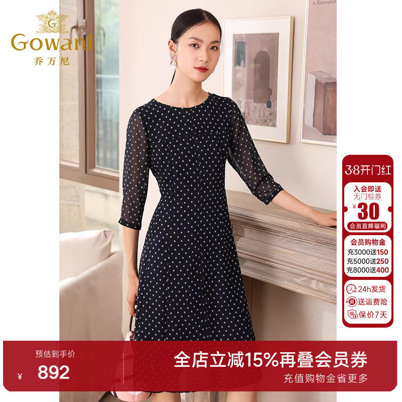 乔万尼春装商场新款时尚修身气质波点七分袖精致连衣裙女士中长款