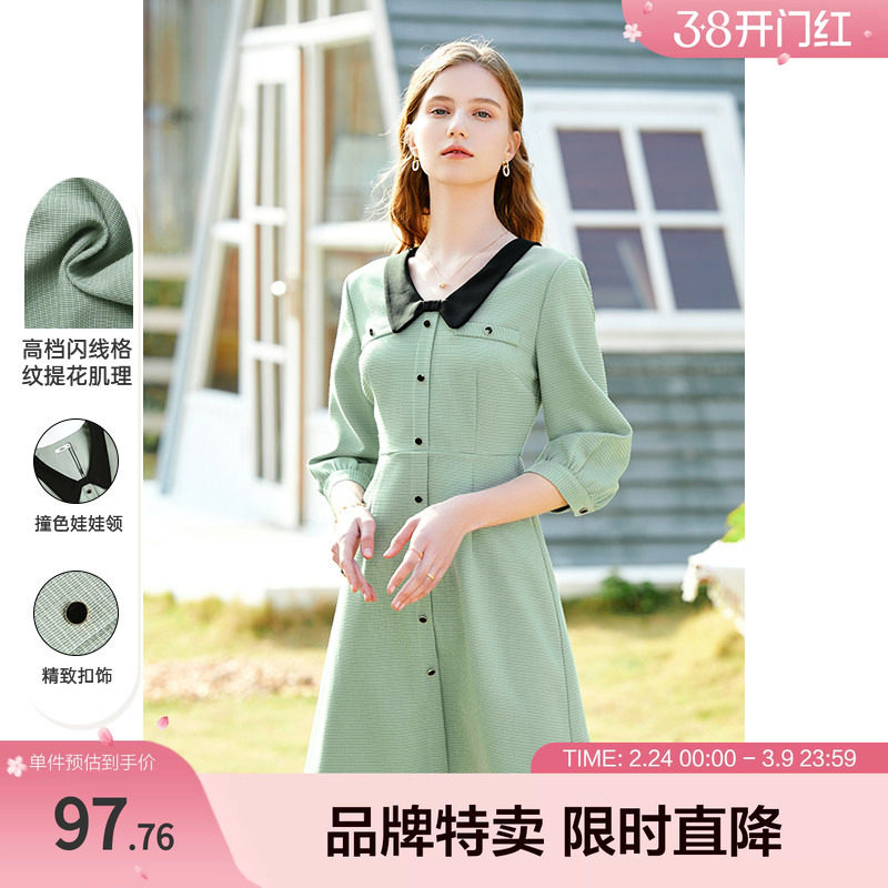 清仓春装新款高端气质女装显瘦中长款撞色圆领七分袖大摆连衣裙子