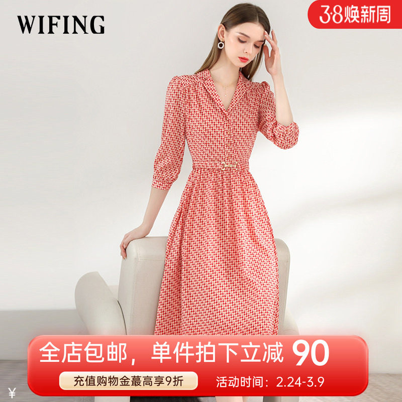 未风红色雪纺连衣裙女春2026春装新款女装气质七分袖显瘦长款裙子