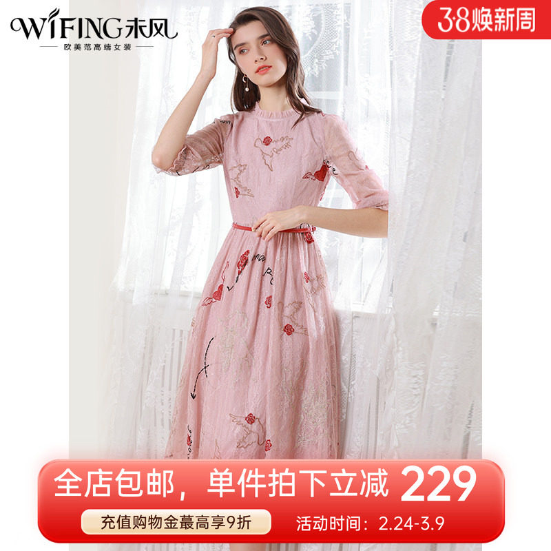 未风粉色蕾丝刺绣连衣裙女春2026春装新款女装气质显瘦七分袖裙子