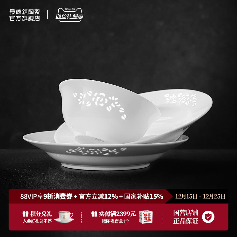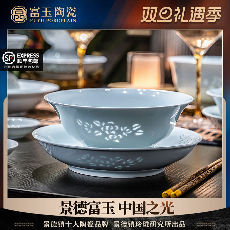 富玉景德镇陶瓷餐具纯白中式玲珑瓷碗盘家用套装乔迁新居礼物高端