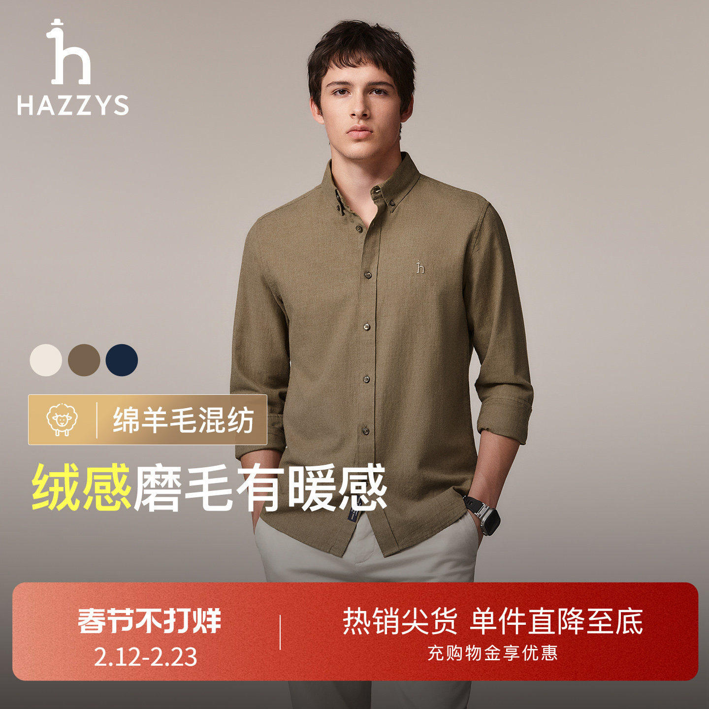 【羊毛混纺】Hazzys哈吉斯秋冬季磨毛长袖衬衫商务休闲通勤上衣男