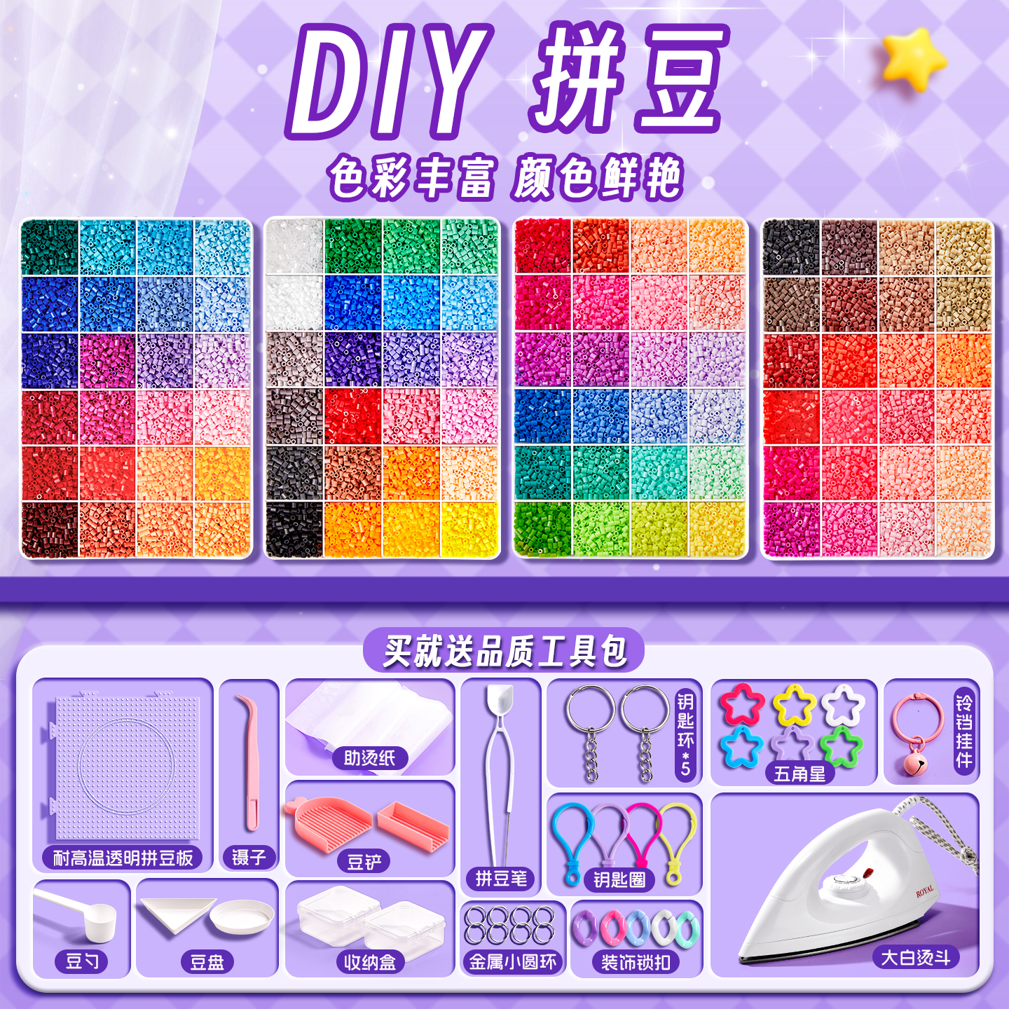 拼豆全套工具手工diy材料包96色小颗粒拼豆套装补充包熨斗烫纸笔