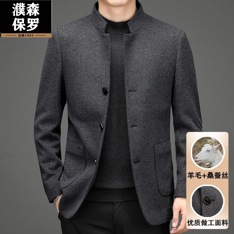 皮尔卡丹纯羊毛中山装套装男中年正装爸爸装结婚礼服中华立领西服
