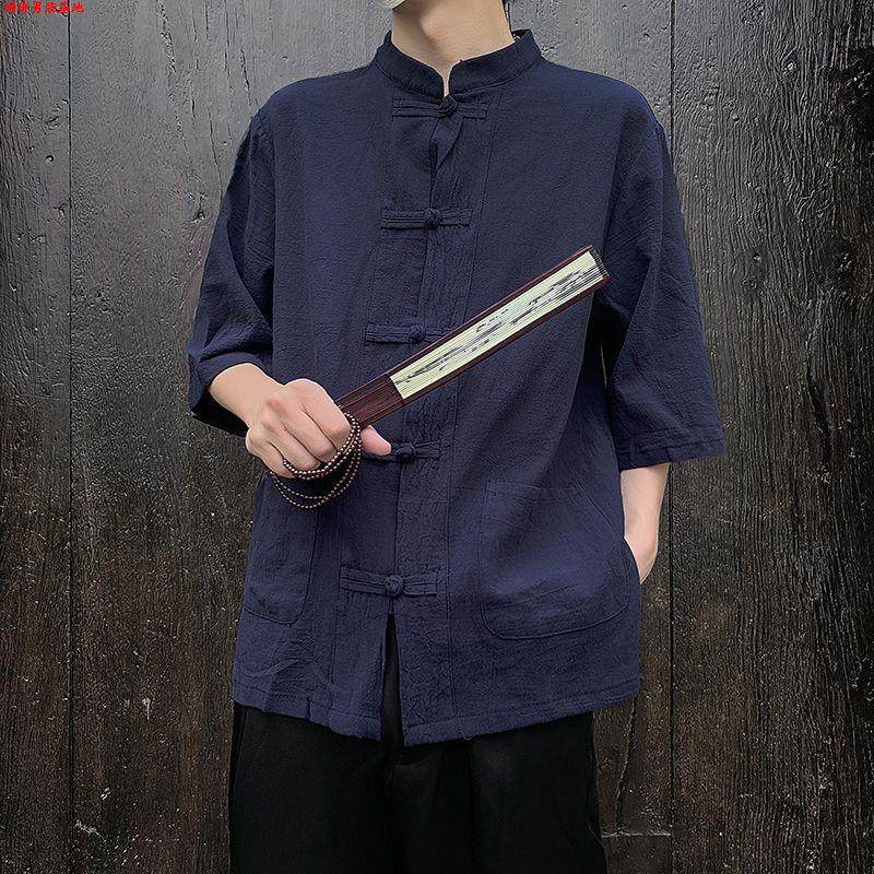 中国风男装春季盘扣长袖衬衫中式亚麻衬衣中华立领外套唐装居士服