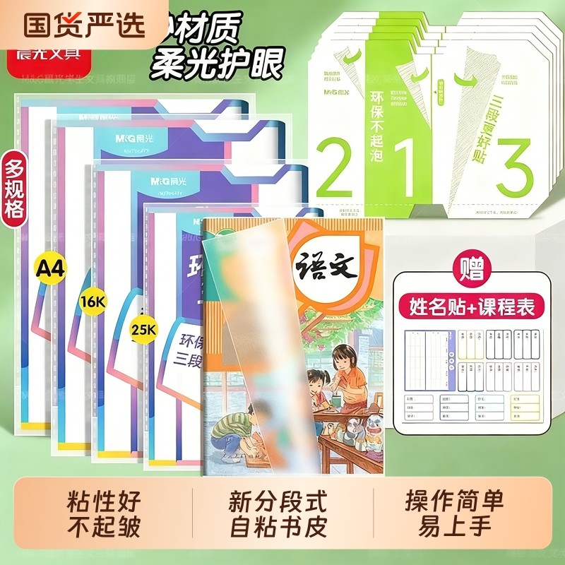 晨光2026新款三段式书皮中小学生专用书皮贴纸自粘透明磨砂加厚A4课本保护套16K一体化书壳全套包装防水书套
