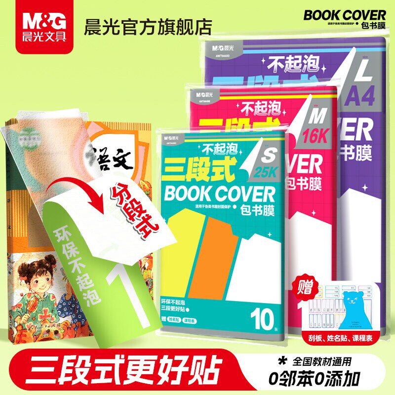 【三段式环保不起泡】晨光分段式自粘书皮透明磨砂加厚防水书皮一年级小学生课本保护套16K一体化书壳包书膜