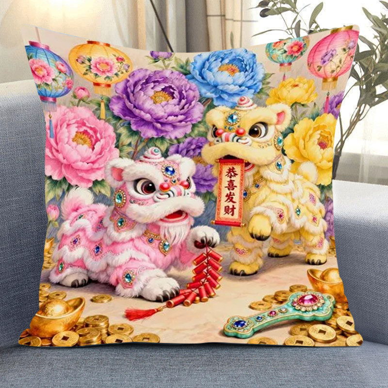双狮纳福十字绣2026新款满绣花开富贵恭喜发财自己手工刺绣抱枕套