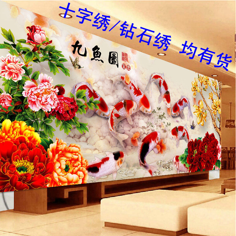 KS色系新款客厅大幅钻石画满钻绣花开富贵牡丹花锦鲤九鱼图十字绣