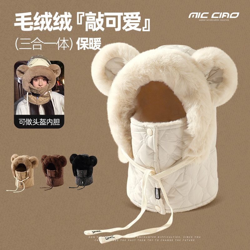 可爱小熊耳朵毛绒护耳帽围脖一体防寒帽子女冬季加绒加厚保暖冷帽