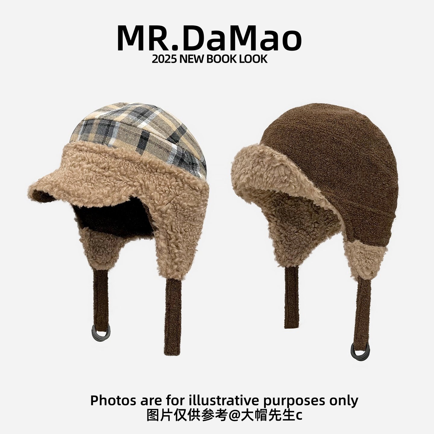 咖色加绒双面羊羔绒飞行帽子女戴格纹护耳帽秋冬加厚保暖雷锋帽男