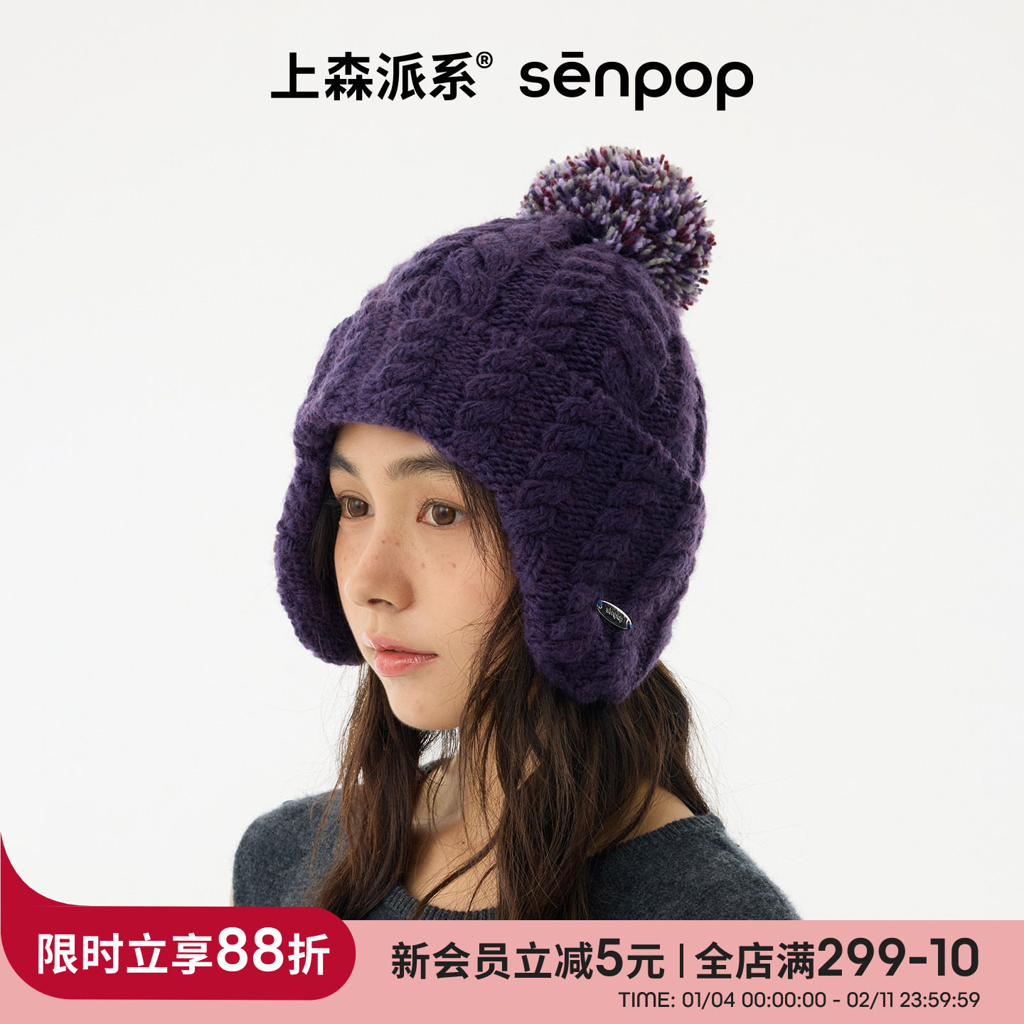 上森毛线帽子女款2025新款秋冬羊毛帽显脸小保暖防风帽护耳针织帽