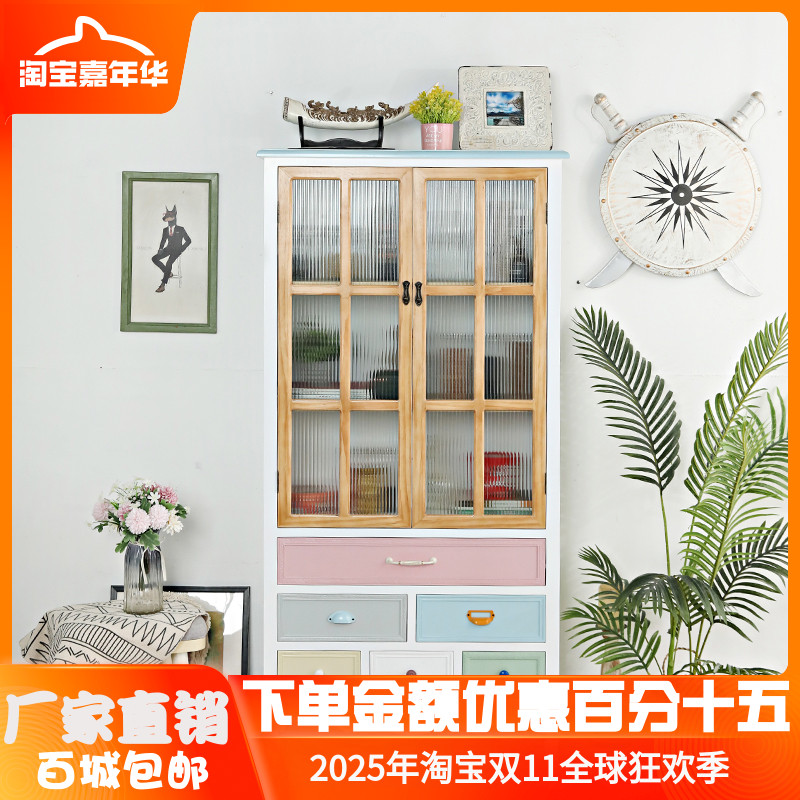 美式实木书柜带门玻璃置物架落地展示柜家用网红储物柜收纳斗柜子