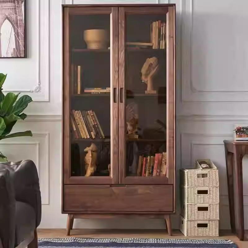 北欧实木书柜带门落地书橱玻璃门客厅柜子靠墙黑胡桃木酒柜置物柜