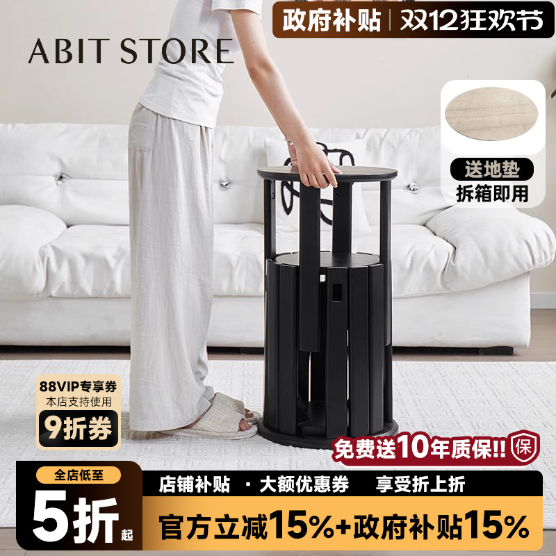 实木圆凳可叠放凳子带滑轮家用餐凳茶几凳客人备用凳叠叠乐中古风