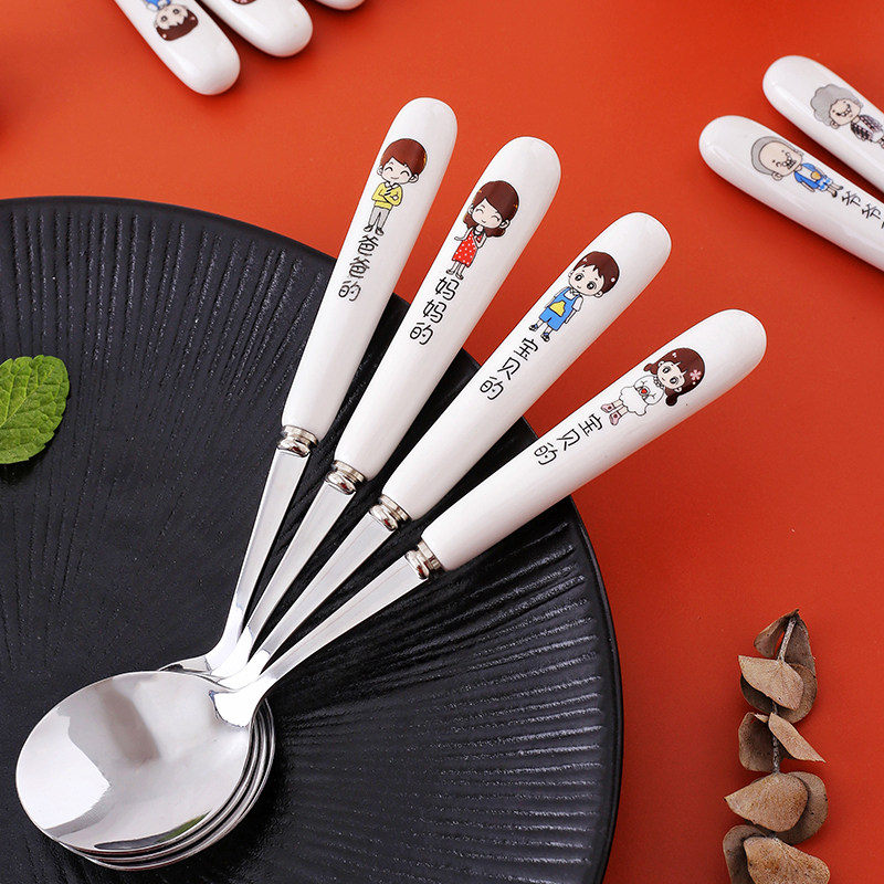家庭分餐勺卡通长柄汤勺创意陶瓷柄不锈钢勺子可爱一家人儿童饭勺