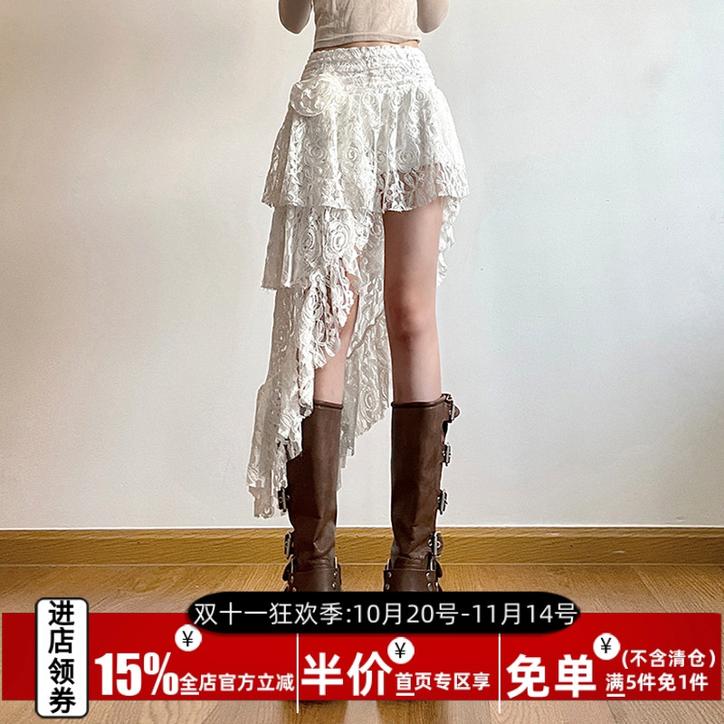 H家欧美女装 波西米亚游牧风不规则蕾丝半身裙轻薄垂感A字中长裙