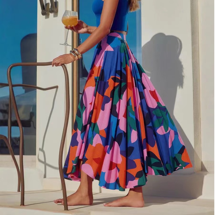 欧美复古印花波西米亚度假风高腰沙滩裙大摆中长款棉绸半身裙夏女