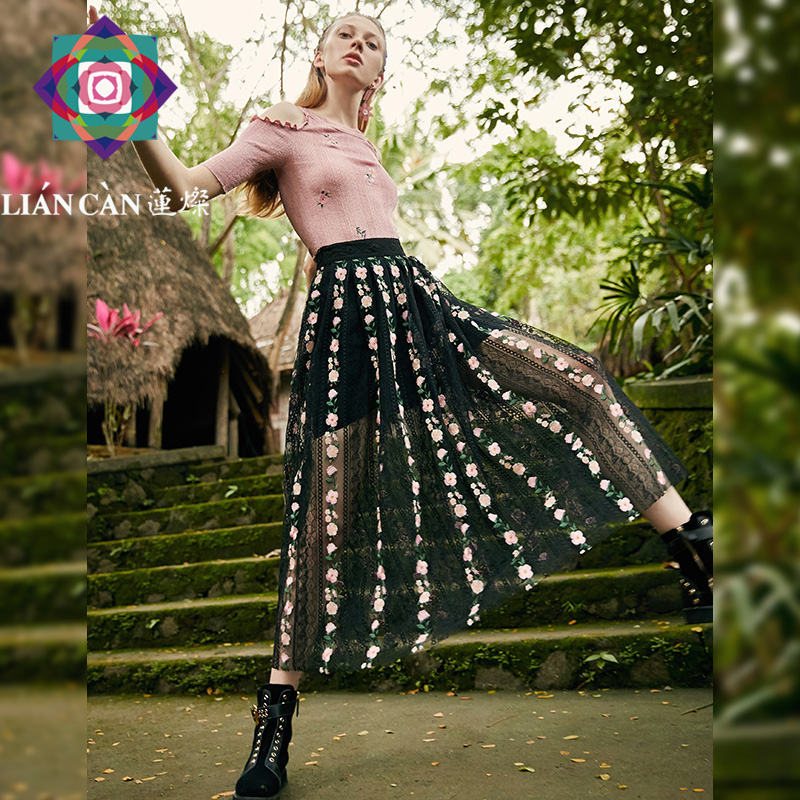 莲灿波西米亚碎花刺绣百褶中长款高腰大摆蕾丝半身裙7120353005