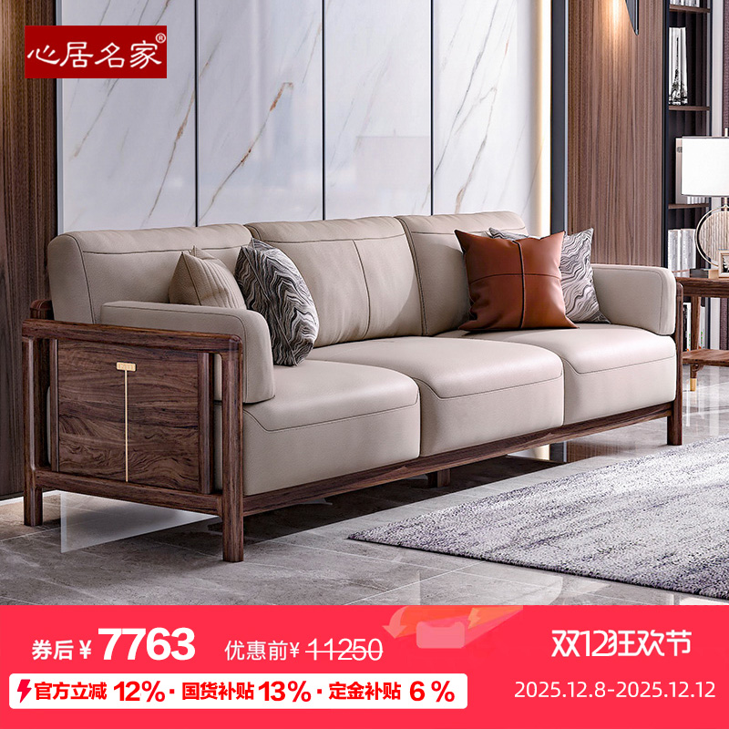 新中式北美黑胡桃实木沙发茶几组合大小户型意式客厅真皮家具定制