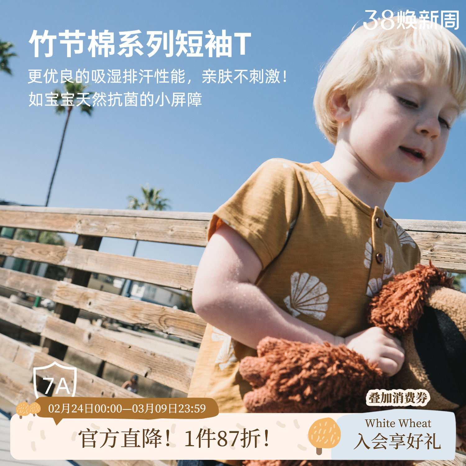 whitewheat2025夏季新款短袖男女童圆领宝宝竹节棉抗菌纯棉薄T恤