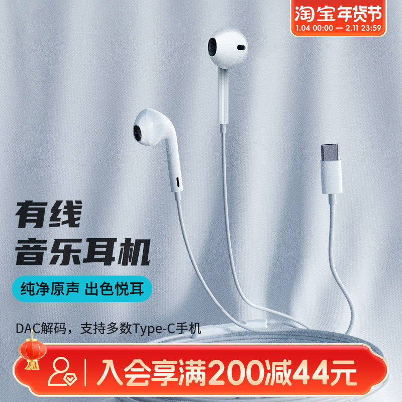 有线耳机半入耳式圆头带麦音乐电话线控Type-C适用苹果华为安卓