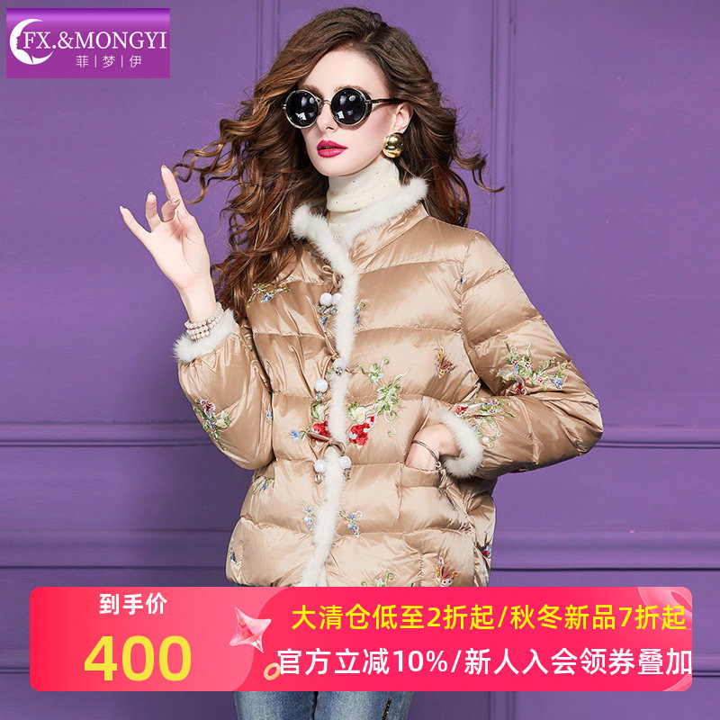 菲梦伊水貂毛领绣花90白鹅绒羽绒服女冬季新中式立领保暖大码外套