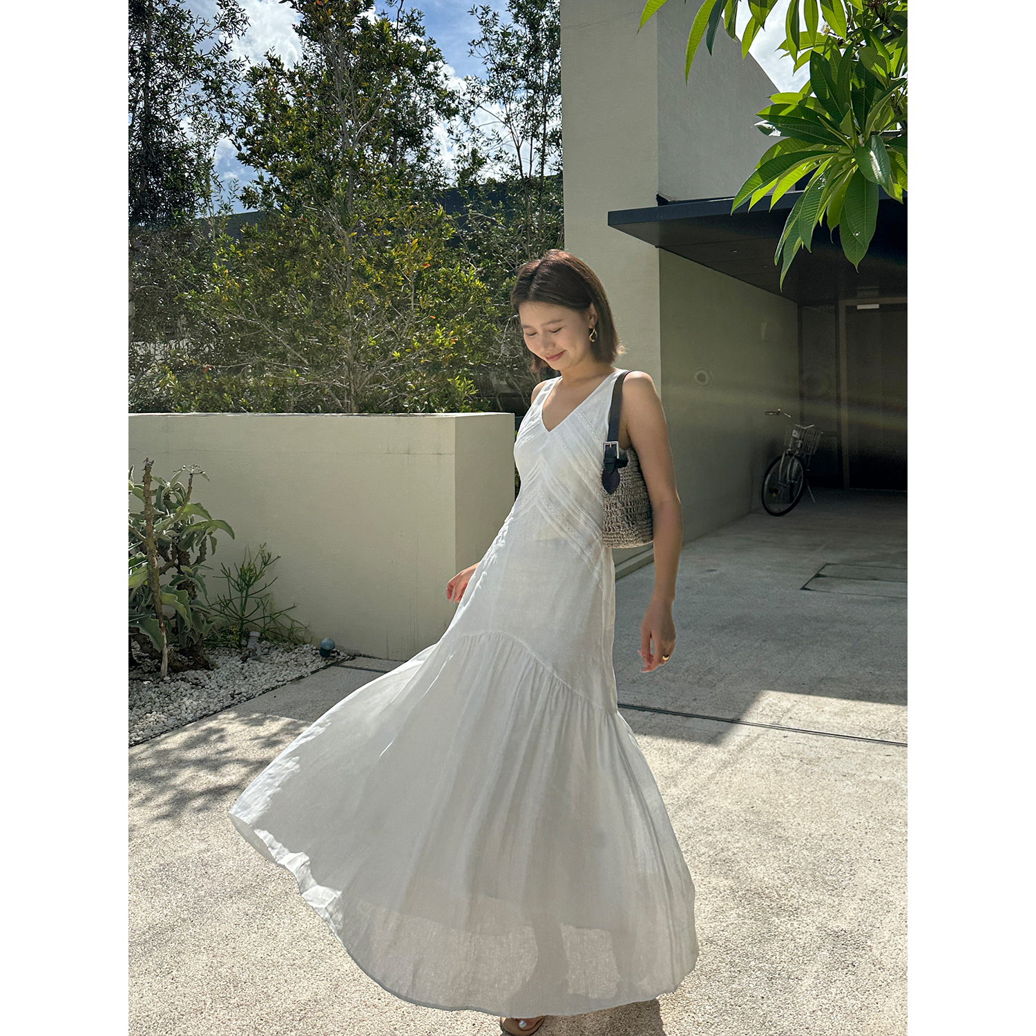 YANGLE_白色亚麻连衣裙女夏2025年新款度假风无袖气质V领背心长裙