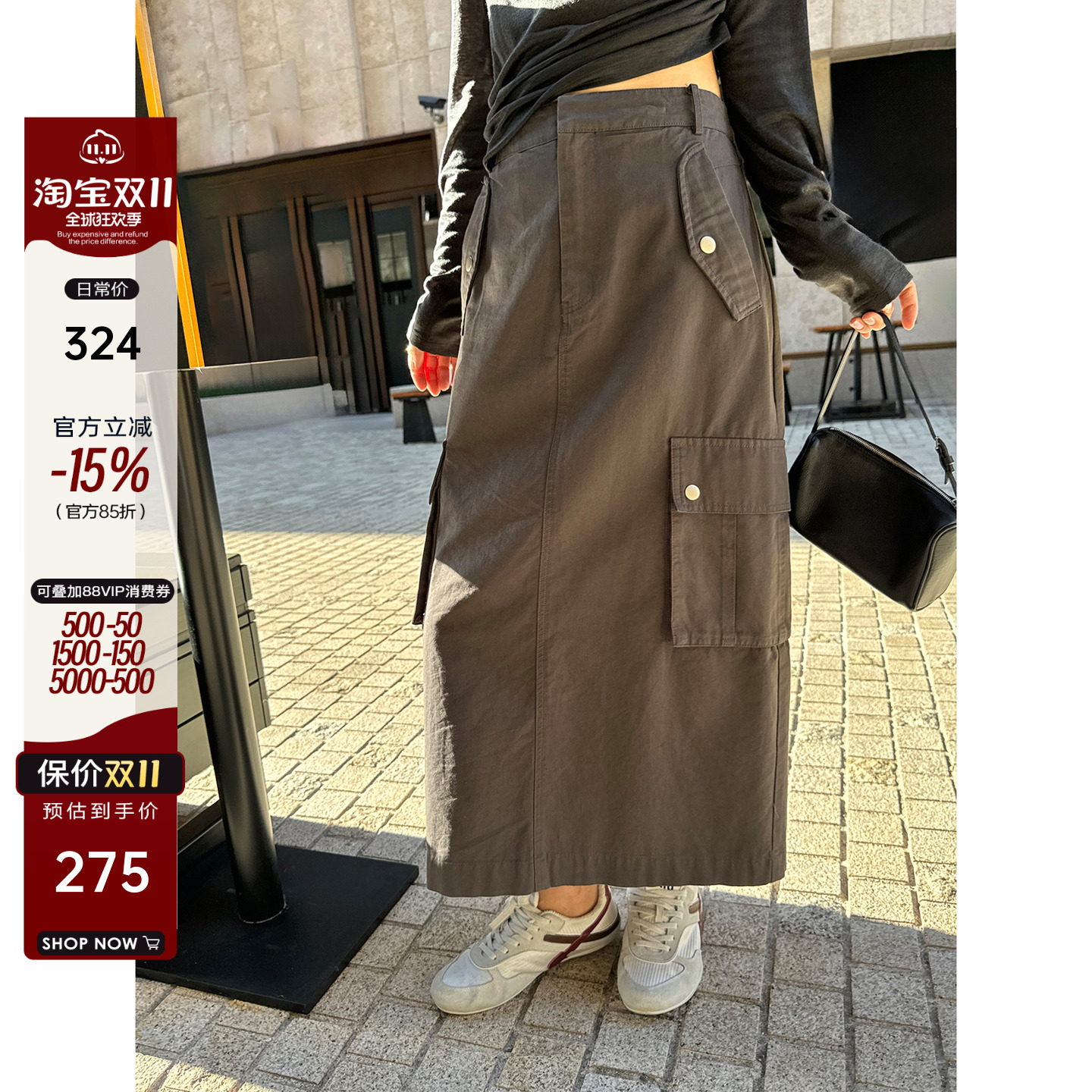 YANGLE_工装半身裙女2025新款秋季高腰宽松直筒休闲卡其天丝长裙