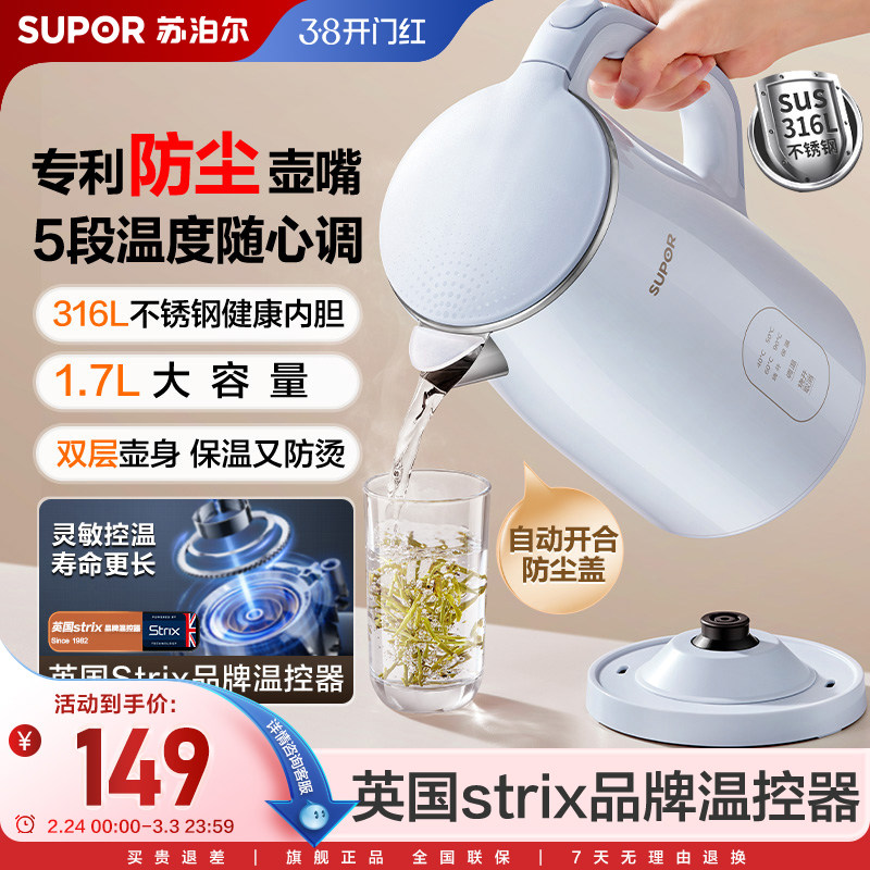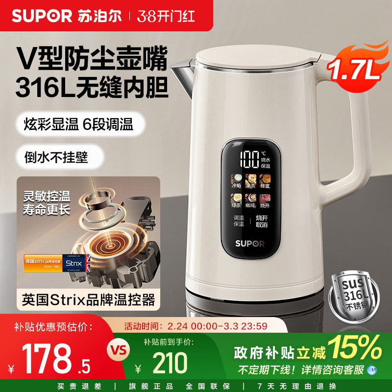 苏泊尔电热水壶家用大容量316L不锈钢内胆智能控温大容量烧水壶