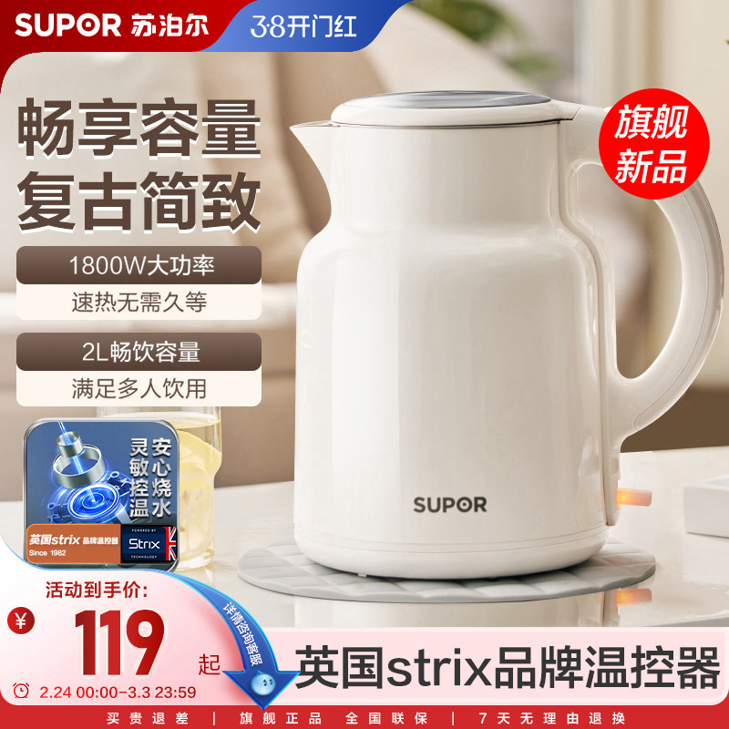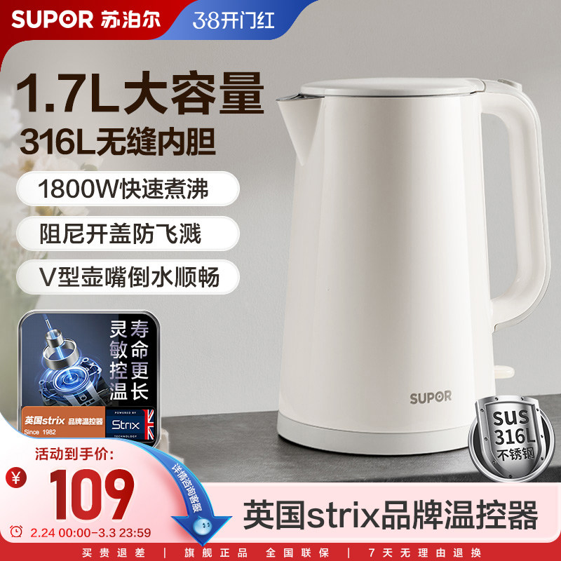 苏泊尔电热水壶2L快速家用烧水保温电水壶316L不锈钢双层开水壶