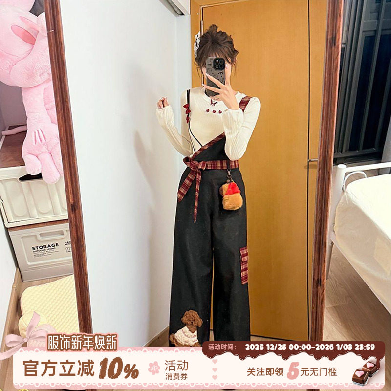 织物猪 覆盆子莓果 甜酷风复古小狗休闲裤子女秋冬红格背带长裤