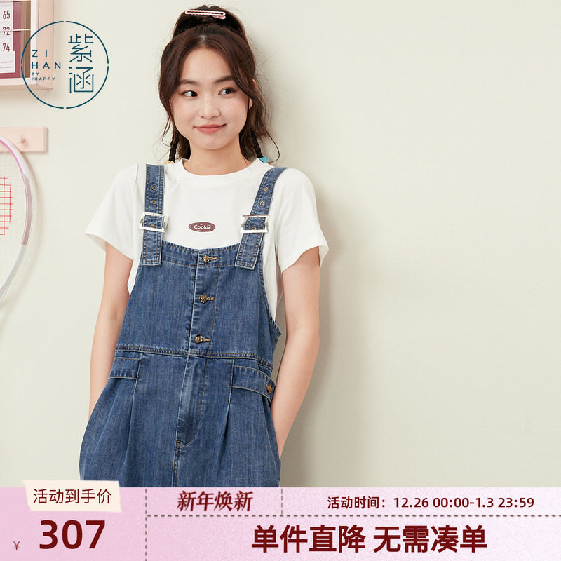 织物猪 牛仔很忙 蓝色牛仔背带裤套装女小个子可爱甜妹直筒长裤子