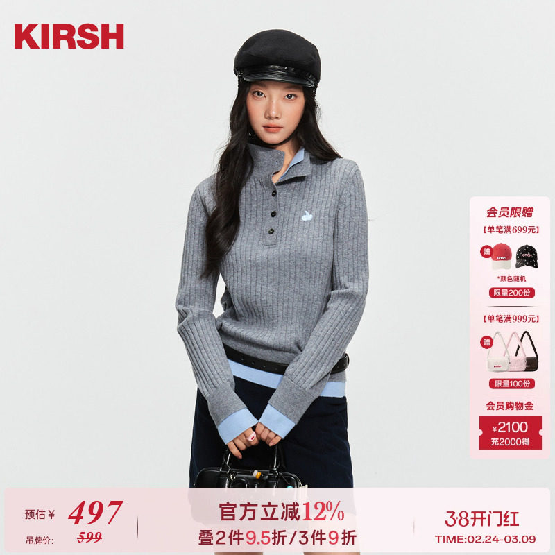 樱桃KIRSH 经典刺绣撞色假两件针织毛衣女2026春季Polo领长袖上衣
