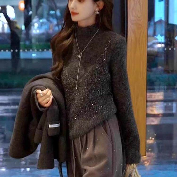 时尚亮片假两件针织毛衣女2025年春秋新款洋气半高领显瘦别致上衣