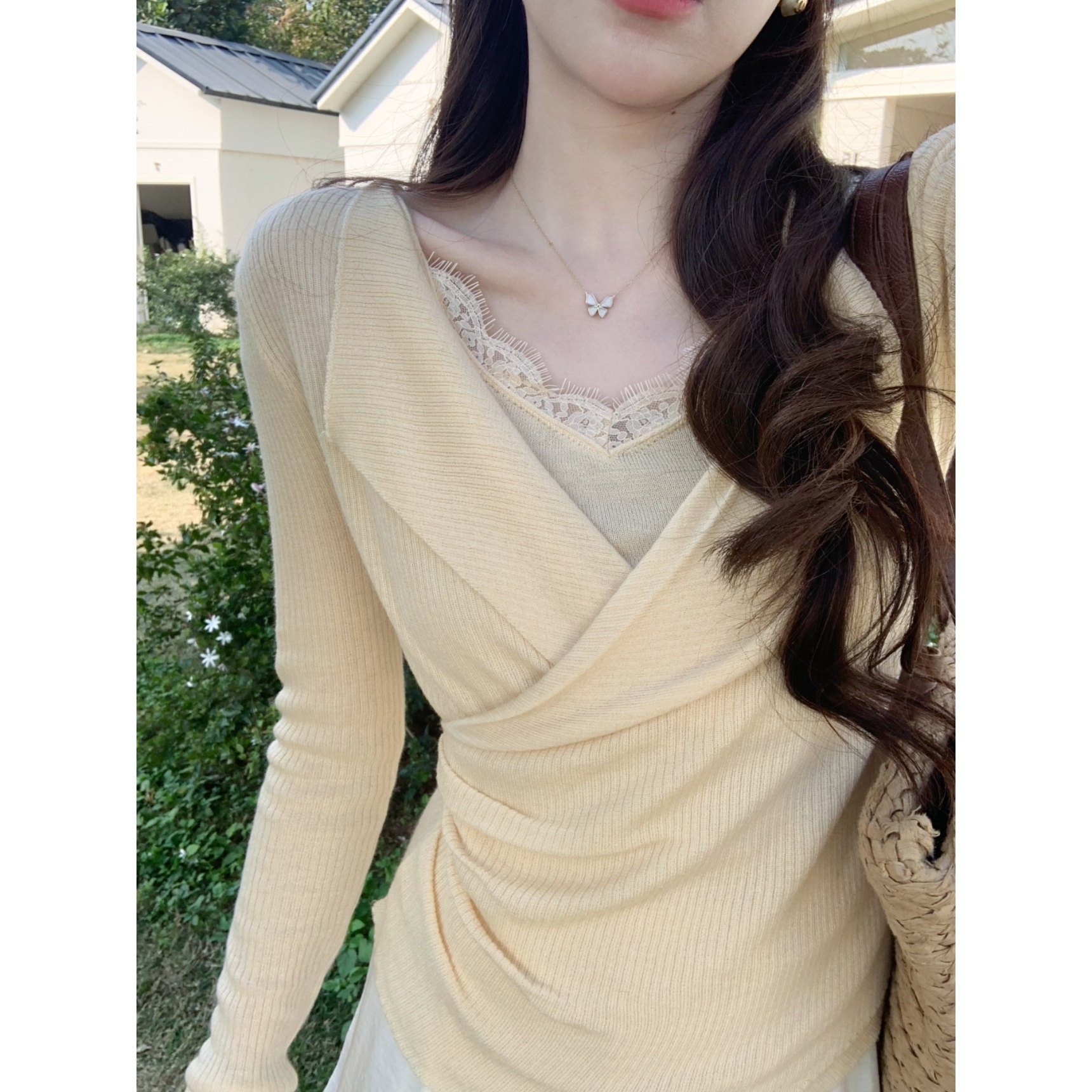 法式拼接假两件针织毛衣女2026年春季新款减龄V领内搭轻奢打底衫