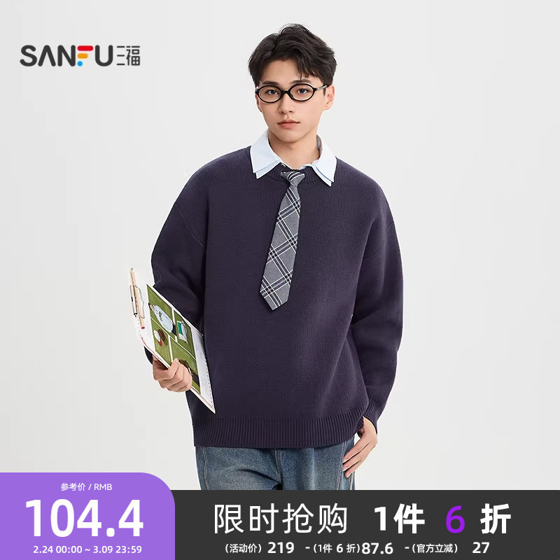 三福2025冬季男士领带假两件针织毛衣 休闲美式套头上衣513391