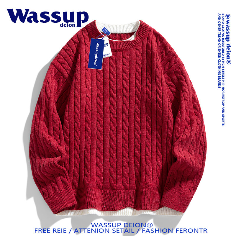 Wassupdeion潮牌假两件针织毛衣男秋冬季酒红色情侣款保暖套头衫