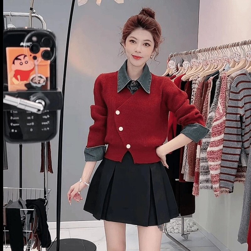 高级感拼接牛仔翻领假两件针织毛衣女秋冬季复古小众百搭休闲上衣