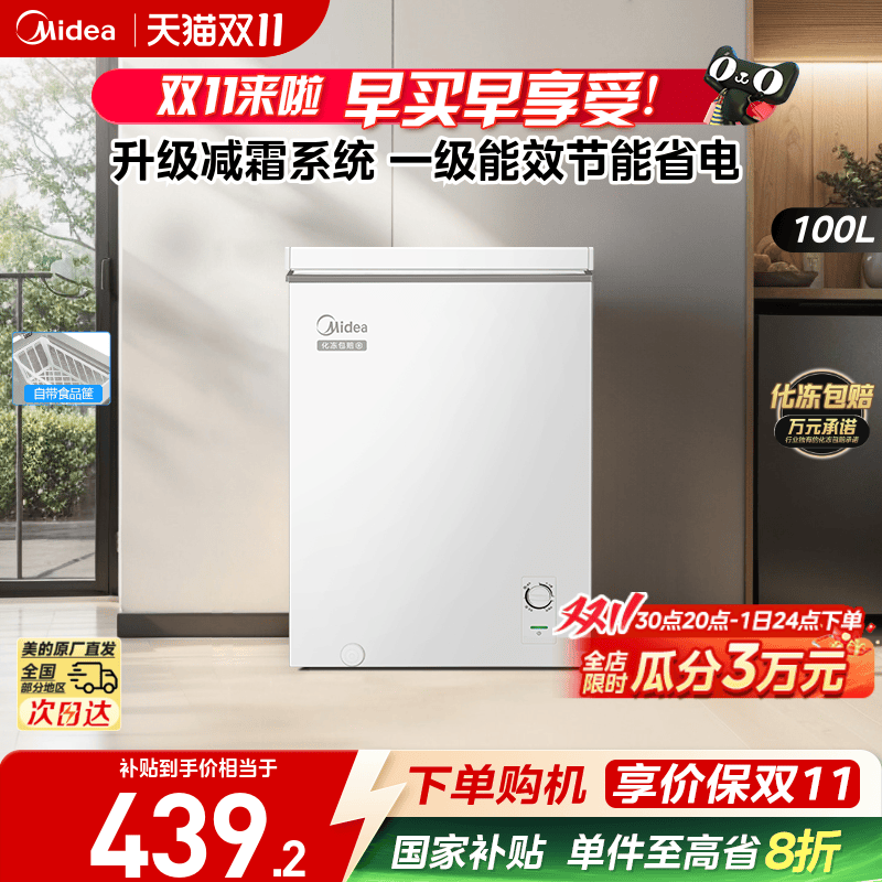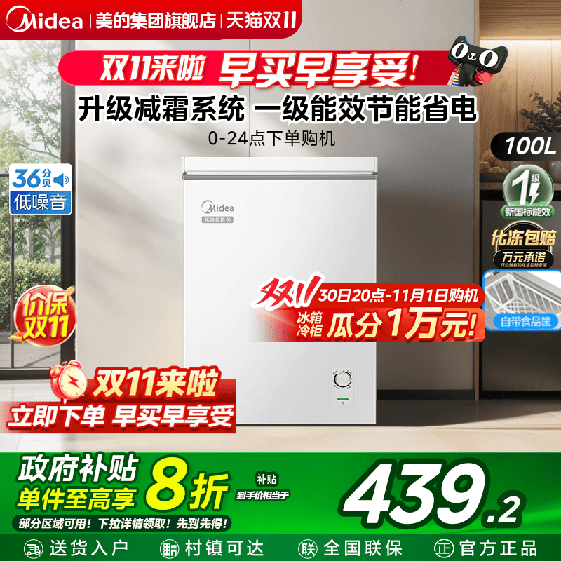 美的100L小冰柜家用小型冷柜商用冷冻柜冷藏两用一级节能迷你冰箱