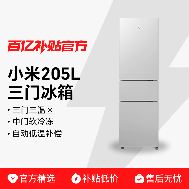 小米米家205L铂银三开门省电静音节能冷冻冷藏迷你出租房宿舍冰箱