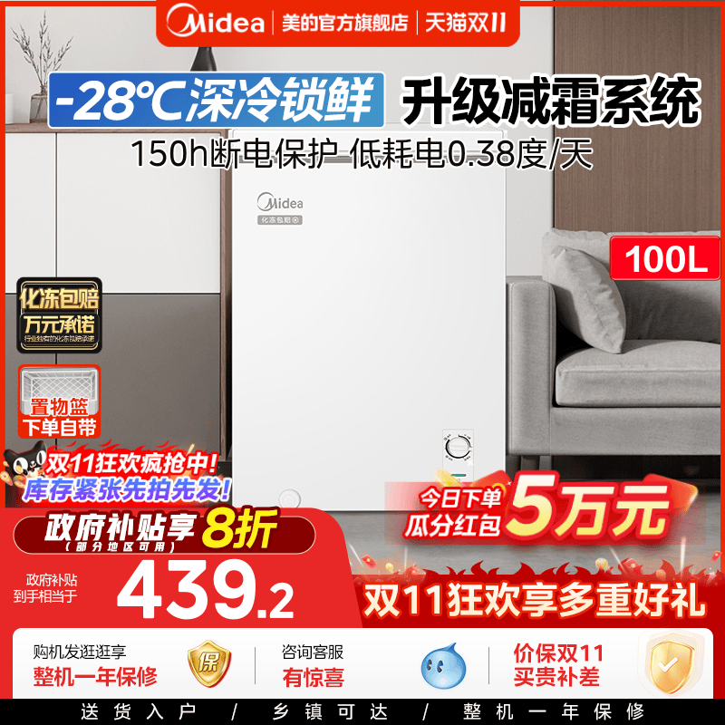 美的100升小冰柜小型商用冷柜家用保鲜冷冻卧式节能迷你冰箱囤货