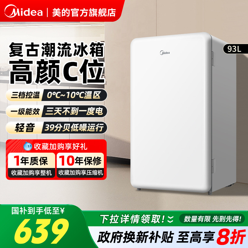 【全国补】美的93小家用单门复古母乳一级宿舍办公室冷藏迷你冰箱
