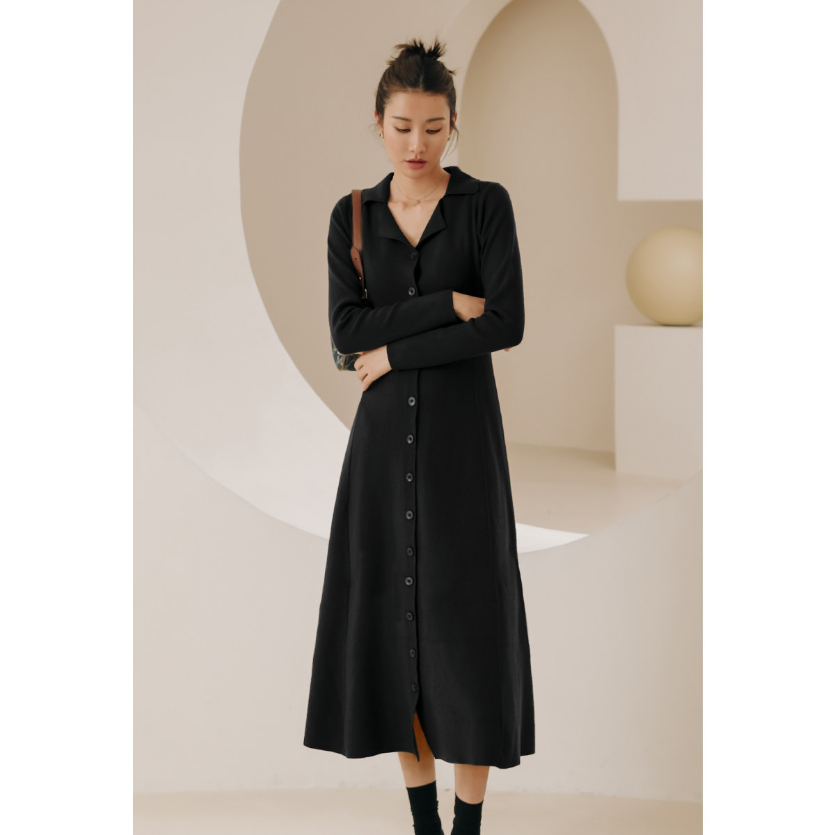 one more翻领polo领高级感长袖连衣裙女2025初秋针织打底裙长裙