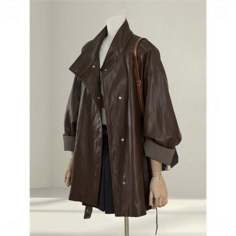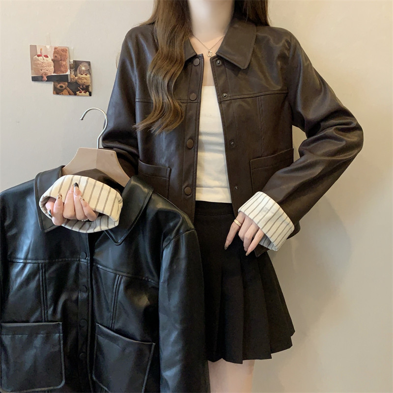 特大码女装胖mm美式复古咖色皮衣外套女高级感宽松显瘦夹克上衣潮