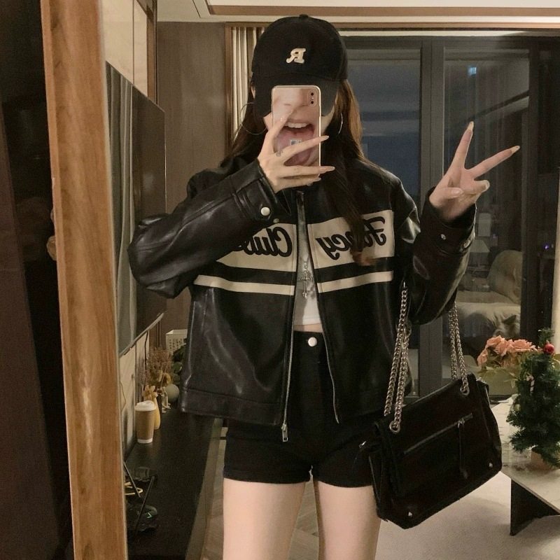 特大码女装胖mm美式复古风黑色皮衣女高级感宽松显瘦机车夹克外套