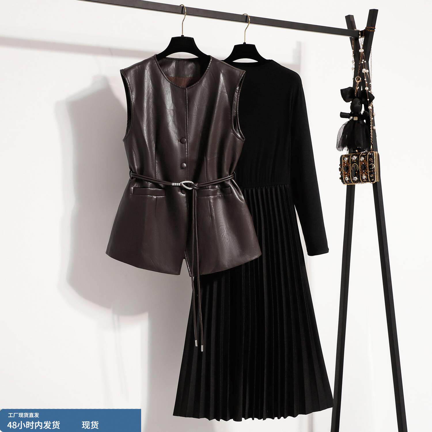 高级感皮衣马甲连衣裙女秋冬大码胖mm显瘦遮肚子超火减龄两件套装